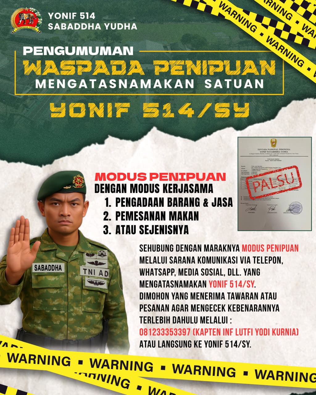 Jika Anda menerima pesanan atau permintaan barang/jasa yang mengatasnamakan Yonif 514/SY Kostrad, tetap tenang dan jangan langsung percaya.