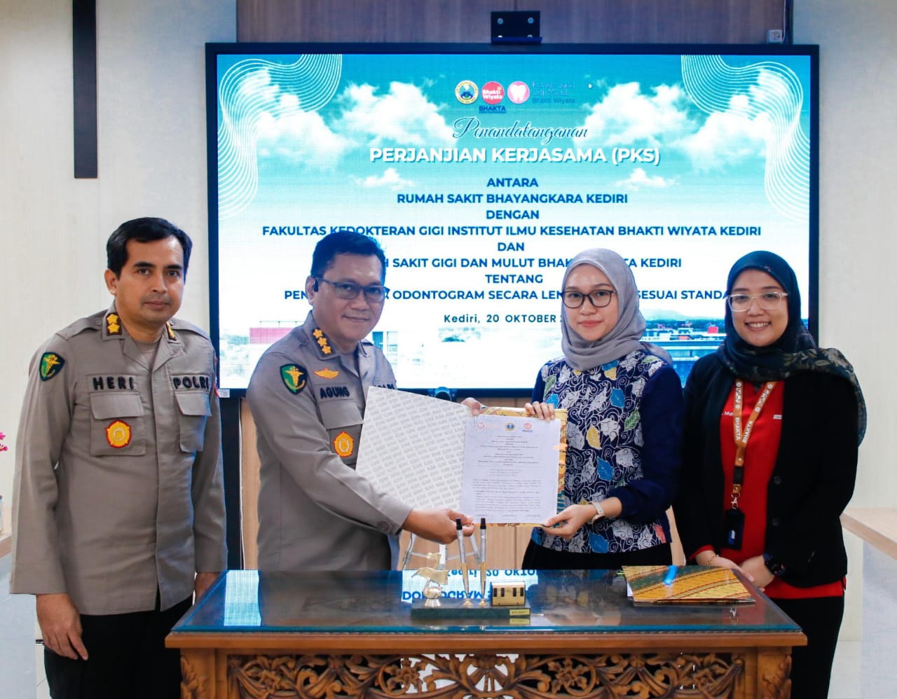 Kediri – Kepala RS Bhayangkara Kombespol drg. Agung Hadi Wijanarko Sp.BM, MARS, C.M.C, QHIA menunjukkan perjanjian kerja sama pengisian odontogram berstandar bersama FKG IIK Bhakti Wiyata dan RSGM Bhakti Wiyata.